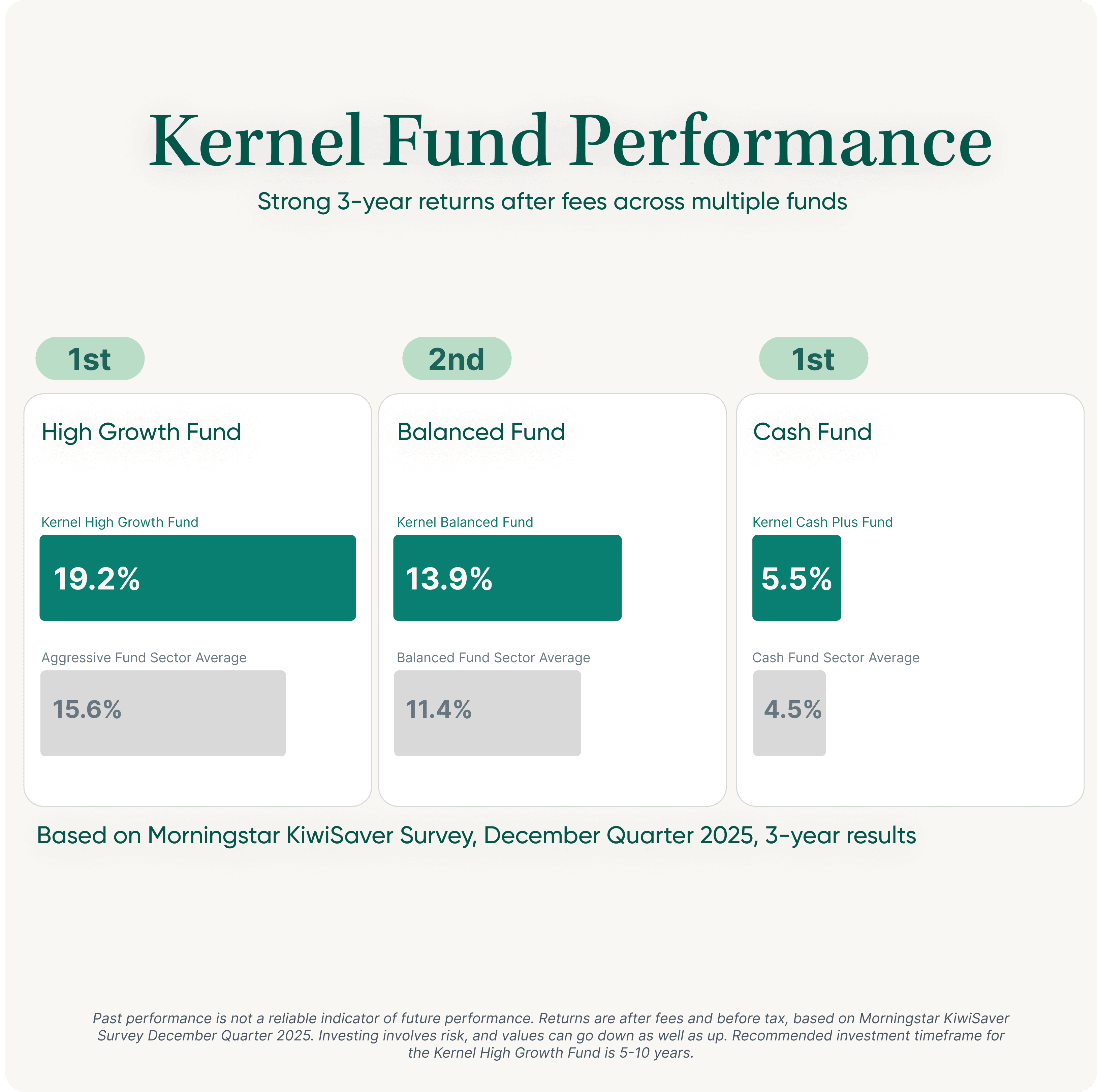 The Kernel KiwiSaver Plan has ranked #1 for 3-year returns in the High Growth and Cash categories for the year ending 31 December 2025*.
